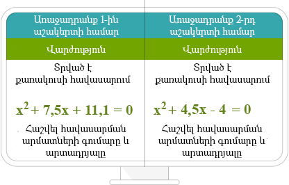 Որպես օրինակ կարող ենք ներկայացնել առաջադրանք «Հանրահաշիվ» առարկայից Վիետի թեորեմի վերաբերյալ: Վիետի թեորեմը.