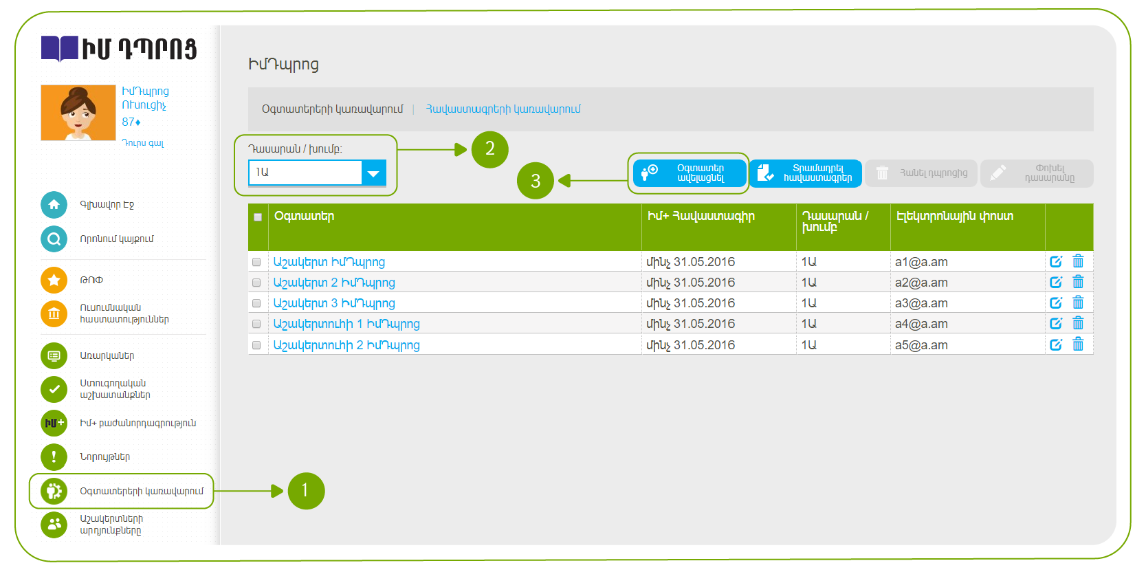 Նոր աշակերտ գրանցելու համար, սեղմեք «Օգտատեր ավելացնել» կոճակը ③։