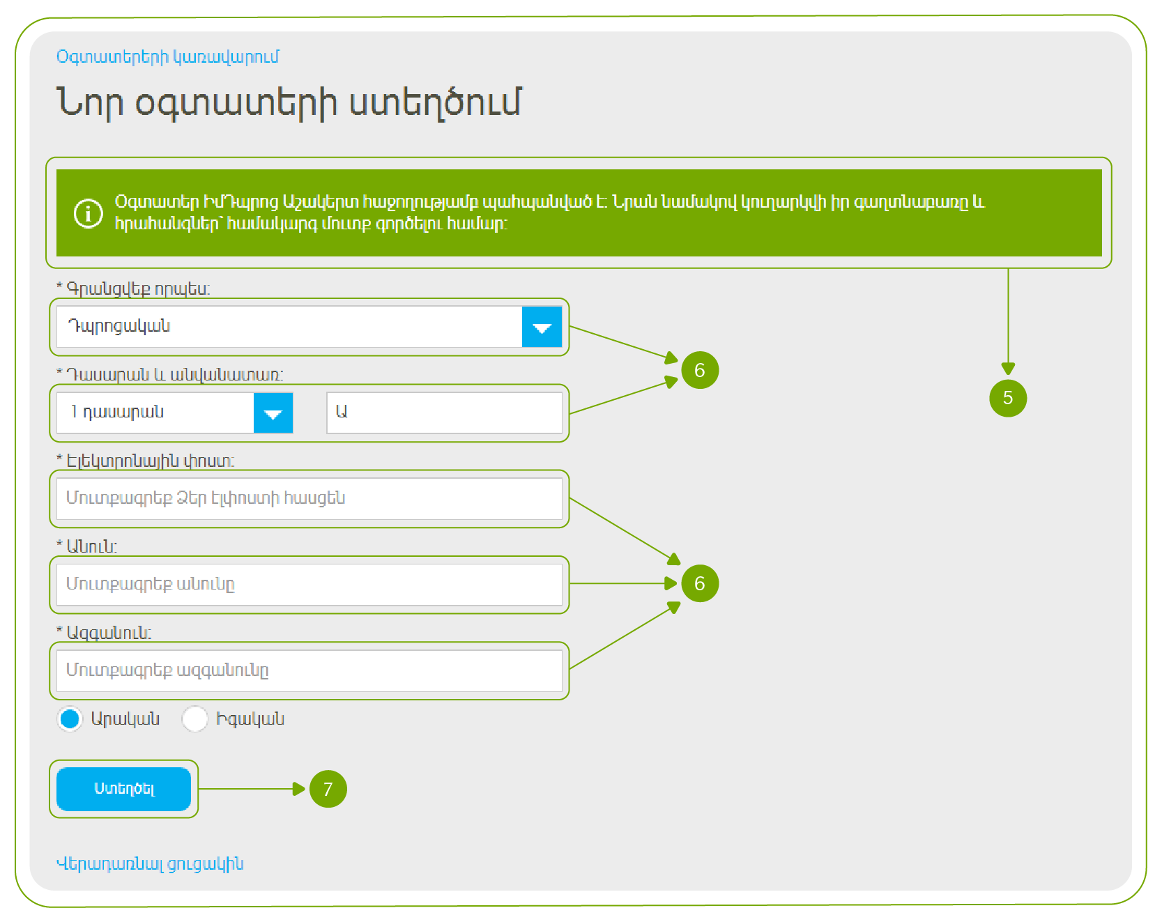 • «Նոր օգտատերի ստեղծում» բաժնից դուրս գալու համար սեղմեք «Վերադառնալ ցուցակին» կոճակը: ⑦ Դուք կվերադառնաք դպրոցի օգտատերերի ցուցակին: