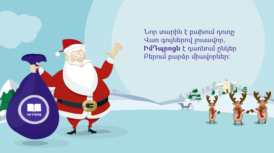 Թող Նոր տարում իրականանան բոլորիդ ամանորյա երազանքները և Ձեր կյանքը լցվի խինդով ու ուրախությամբ: Թող 2016 թվականը լինի նոր բարձունքների, հաղթանակների և ուսումնական հաջողությունների տարի: Իսկ նոր ձեռքբերումները Ձեզ սպասեցնել չեն տա, եթե Դուք միանաք մեզ: ԻմԴպրոցը միշտ Ձեզ հետ կլինի, կդառնա Ձեր մշտական օգնականը և հավատարիմ ընկերը կրթության զարմանահրաշ աշխարհում: