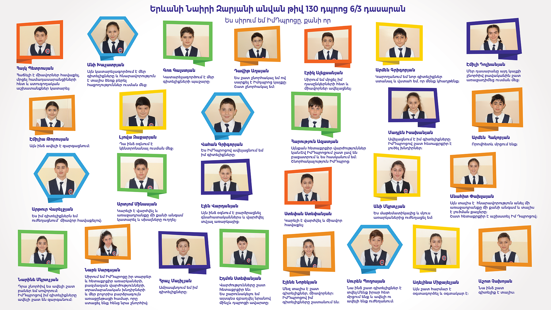 Մենք փորձեցինք կրթությունը դարձնել հասանելի, իսկ գիտելիքը՝ դյուրին յուրաքանչյուր մասնակից աշակերտի համար՝ տալով Ձեզ՝ մեր սիրելի երեխաներ, հնարավորություն զգալու գիտելիքի ուժը և նրա շնորհիվ նորանոր բարձրունքներ գրավելու բերկրանքը: Հպարտությամբ կարող ենք ասել, որ ընկերական և թիմային միջավայր ստեղծվեց ոչ միայն անհատապես յուրաքանչյուր դպրոցում, այլև ստեղծվեց մի ամբողջական մեծ ընտանիք բոլոր մասնակից դպրոցներից: